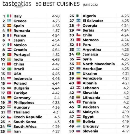 “Ənənəvi yeməklər, yerli inqrediyentlər və orijinal restoranlardan ibarət dünya atlası" kimi xarakterizə edilən “Tasteatlas” 2022-ci ilin iyun ayı üçün “ən dadlı yeməklərə sahib ölkələr”in reytinqini yayımlayıb.