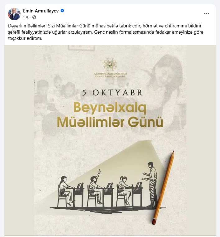 “Dəyərli müəllimlər! Sizi Müəllimlər Günü münasibətilə təbrik edir, hörmət və ehtiramımı bildirir, şərəfli fəaliyyətinizdə uğurlar arzulayıram. Gənc nəslin formalaşmasında fədakar əməyinizə görə təşəkkür edirəm”, - paylaşımda bildirilir.