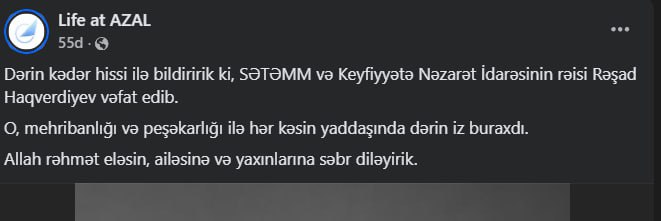 “Dərin kədər hissi ilə bildiririk ki, SƏTƏMM və Keyfiyyətə Nəzarət İdarəsinin rəisi Rəşad Haqverdiyev vəfat edib.