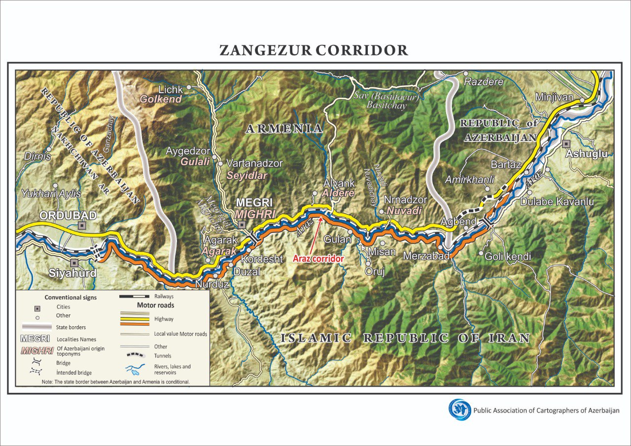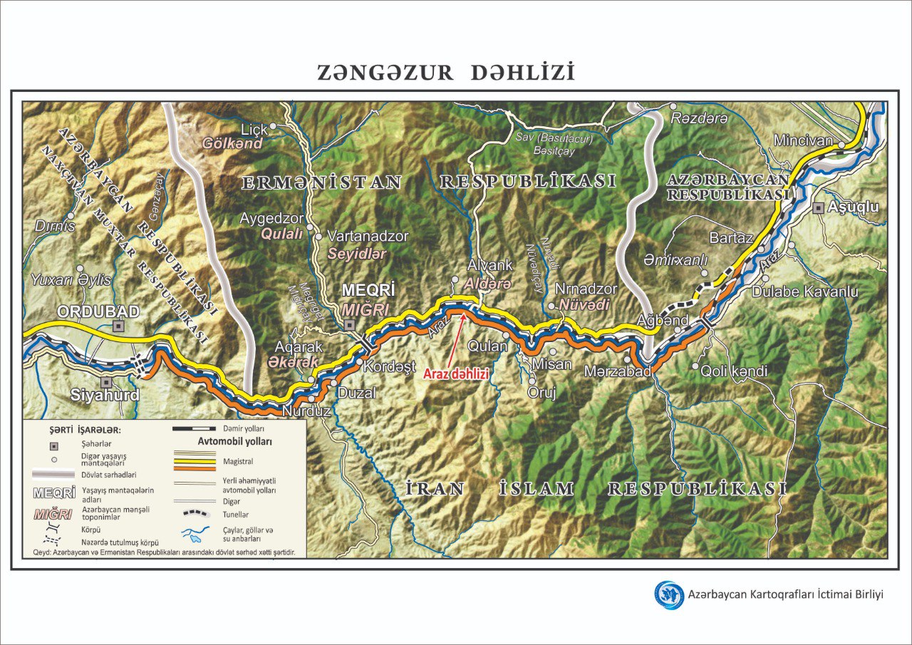 ““Azərbaycan Kartoqrafları” İctimai Birliyi Zəngəzur dəhlizinin xəritəsini hazırlayıb. Xəritənin altlığı yüksək keyfiyyətli kosmik şəkillər əsasında tərtib edilib”.
