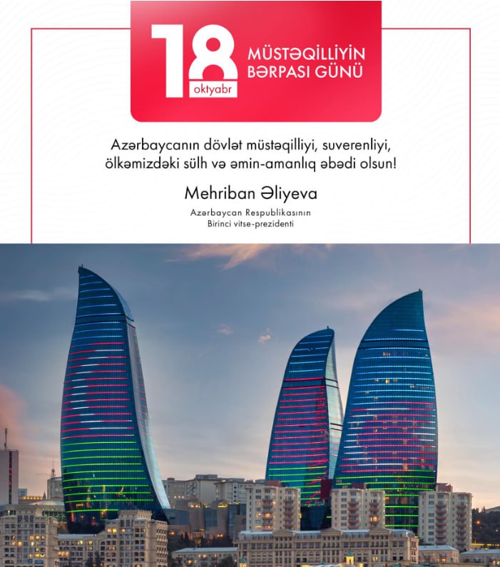 Azərbaycanın Birinci vitse-prezidenti Mehriban Əliyeva 18 oktyabr - Müstəqilliyin Bərpası Günü münasibətilə sosial şəbəkə hesablarında paylaşım edib.