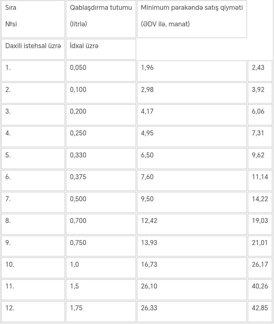 Qərara əsasən, alkoqollu içkilərin pərakəndə satışına dair minimum qiymət aşağıdakı kimi təyin edilib: