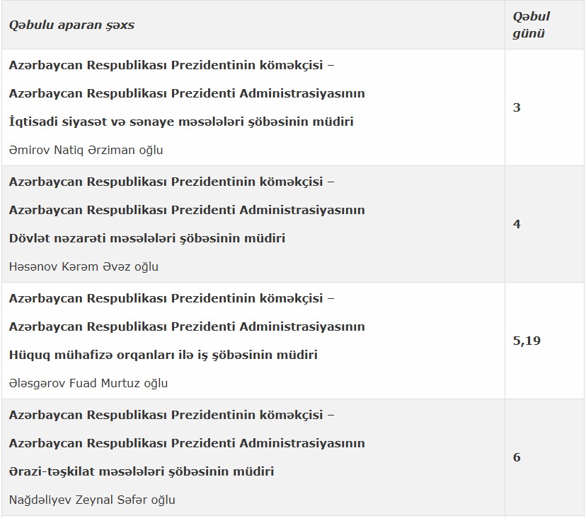 Azərbaycan Prezidenti Administrasiyasının (PA) Vətəndaş Qəbulu Mərkəzində noyabr ayında vətəndaşların qəbulu cədvəli açıqlanıb.