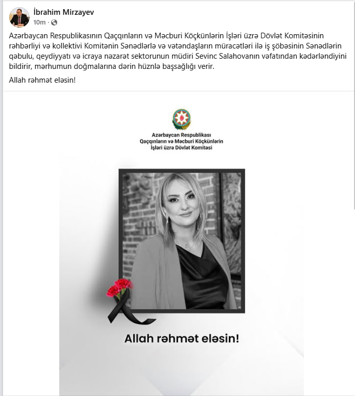 Qaçqınların və Məcburi Köçkünlərin İşləri üzrə Dövlət Komitəsinin Sənədlərlə və vətəndaşların müracətləri ilə iş şöbəsinin müdiri Sevinc Salahova dünyasını dəyişib.