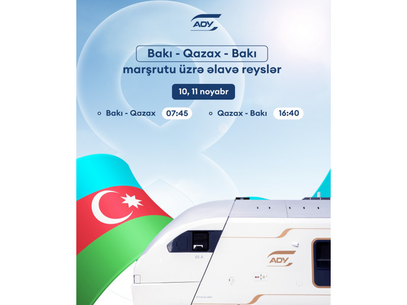 "Azərbaycan Dəmir Yolları" QSC (ADY) Zəfər və Bayraq günləri ilə əlaqədar 10 və 11 noyabr tarixlərinin istirahət günü elan olunmasını nəzərə alaraq, Bakı-Qazax-Bakı marşrutu ilə hər iki istiqamətə əlavə reyslər təyin edib.