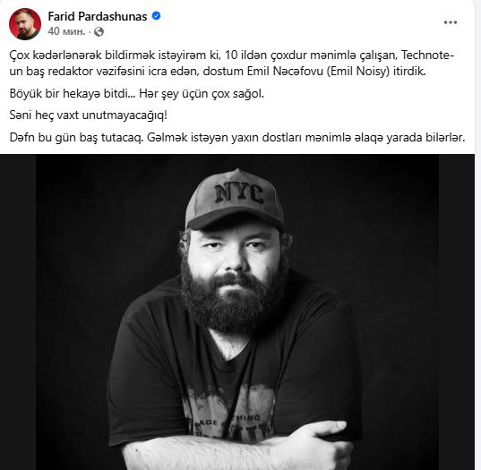 "Çox kədərlənərək bildirmək istəyirəm ki, 10 ildən çoxdur mənimlə çalışan, "Technote"un baş redaktor vəzifəsini icra edən, dostum Emil Nəcəfovu (Emil Noisy) itirdik. Böyük bir hekayə bitdi... Hər şey üçün çox sağol.