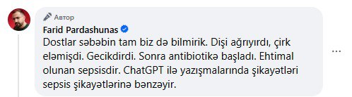 “Səbəbin tam biz də bilmirik. Dişi ağrıyırdı, çirk eləmişdi. Gecikdirdi. Sonra antibiotikə başladı. Ehtimal olunan sepsisdir. ChatGPT ilə yazışmalarında şikayətləri sepsis şikayətlərinə bənzəyir".