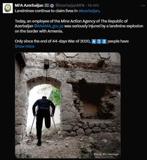 "Bu gün Azərbaycan Respublikasının Minatəmizləmə Agentliyinin əməkdaşı Ermənistan sərhədində minanın partlaması nəticəsində ağır şəkildə yaralanıb. Təkcə 2020-ci ilin 44 günlük Vətən müharibəsindən bu yana 412 nəfər mina qurbanı olub. Mülki şəxsləri hədəf alan, bərpa işlərini ləngidən və təhlükəsiz qayıdışı əngəlləyən bu humanitar faciə beynəlxalq humanitar hüququn ciddi şəkildə pozulmasıdır. Bu fakt həmçinin genişmiqyaslı mina təmizləmə əməliyyatlarının sürətləndirilməsi üçün təcili beynəlxalq dəstəyin vacibliyini bir daha göstərir".