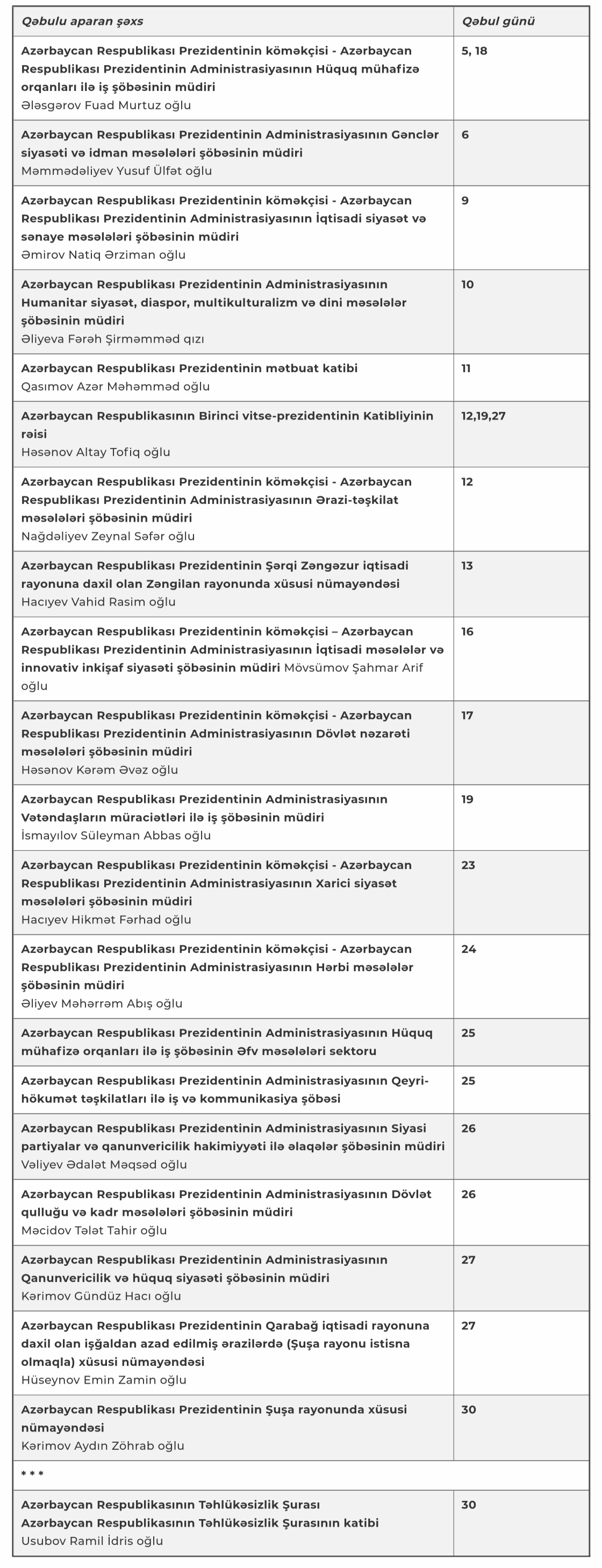PA rəsmilərinin vətəndaşlar üçün qəbul cədvəli açıqlanıb