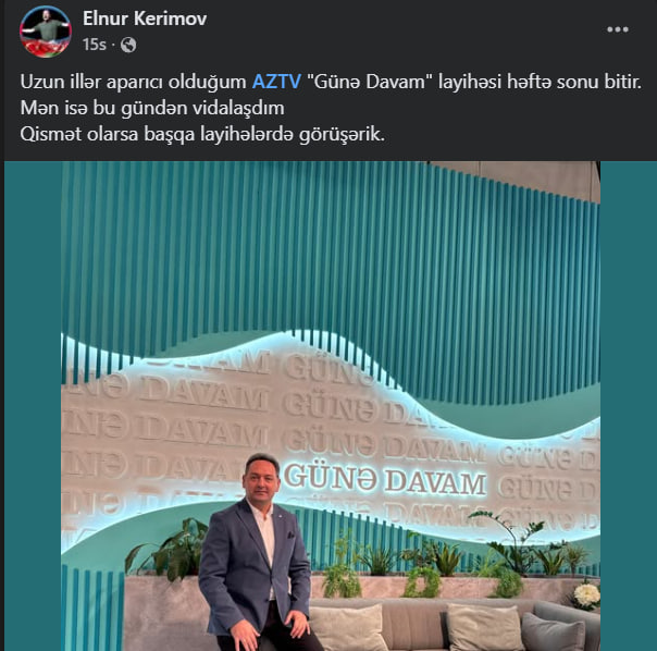 "Uzun illər aparıcı olduğum AzTV-də yayımlanan "Günə Davam" layihəsi həftə sonu bitir. Mən isə bu gündən vidalaşdım Qismət olarsa, başqa layihələrdə görüşərik", - deyə, o bildirib.