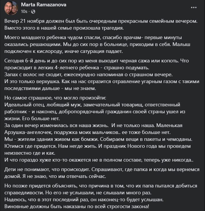 Bizim.Media xəbər verir ki, bunu Yasamaldakı yanğında həlak olan binanın sakini və komendantı Samir Məhəmmədovun həyat yoldaşı Marta Ramazanova feysbuk hesabında yazıb.