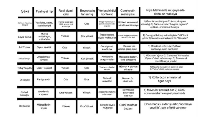 Cədvəllə tanışlıqdan sonra belə qənaətə gəlmək olur ki, 2018-ci ilin sonunda hazırlanmış cədvəlin əsas funksiyası “kimin üzərində daha geniş ictimai reaksiya yarana bilər?” sualına cavab tapmaq olub.