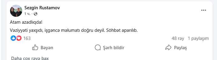 O yazıb: “Atam azadlıqda! Vəziyyəti yaxşıdı, işgəncə məlumatı doğru deyil. Söhbət aparılıb”.