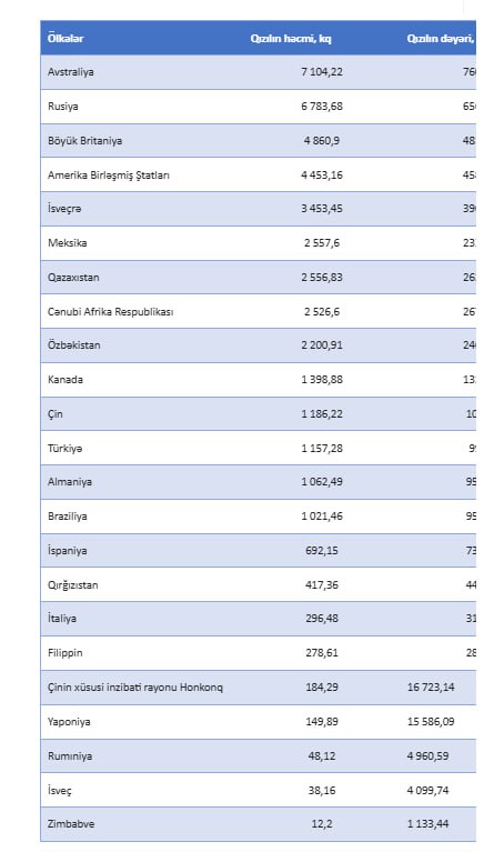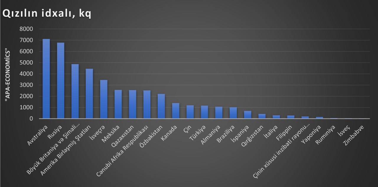 Qeyd edək ki, bu ilin ilk 10 ayında Azərbaycanda qızıl istehsalı 2592.7 kq təşkil edib. Bu dövrdə Azərbaycandan İsveçrəyə 276 milyon 824.5 min ABŞ dolları dəyərində 3970.7 kq emal olunmamış qızıl ixrac edilib. Bu məhsulun 1 kiloqramının orta ixrac qiyməti isə 69 min 715 ABŞ dolları təşkil edib.