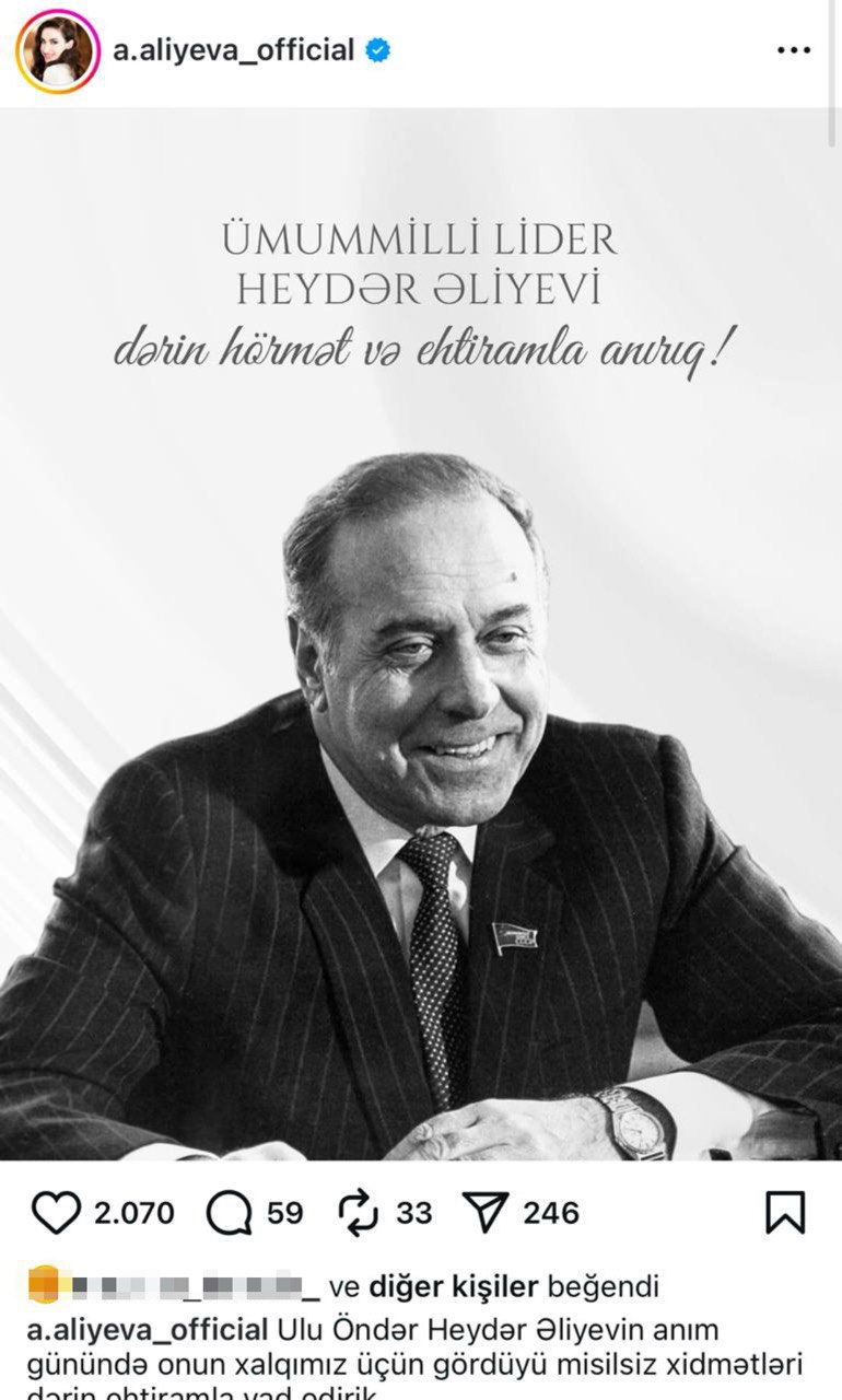 Prezident İlham Əliyevin gəlini Alyona Əliyeva ulu öndər Heydər Əliyevin anım günü ilə əlaqədar paylaşım edib.