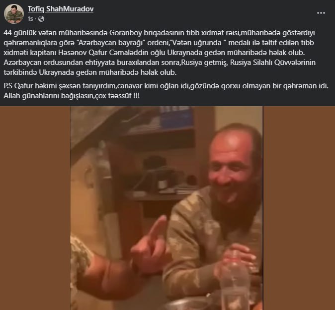 Rusiya Silahlı Qüvvələrinin tərkibində Ukraynada gedən müharibədə həlak olub. Qafur həkimi şəxsən tanıyırdım, canavar kimi oğlan idi, gözündə qorxu olmayan bir qəhrəman idi”, - paylaşımda bildirilib.