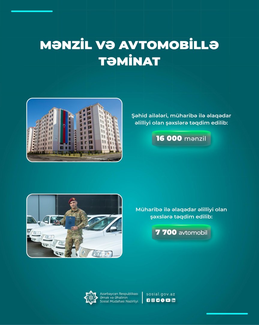 Müharibə ilə əlaqədar əlilliyi olanlara yönələn dəstək tədbirlərindən biri də onların minik avtomobilləri ilə təmin edilməsidir. Bu kateqoriyadan olan vətəndaşlara ötən dövrdə 7700, o cümlədən postmüharibə dövründə 567 avtomobil verilib və növbədə olanların avtomobillə təminatı başa çatıb", nazirlikdən bildirilib.