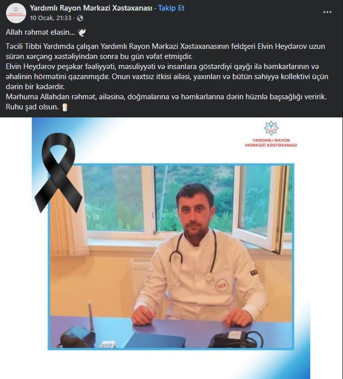 Yardımlı Rayon Mərkəzi Xəstəxanasının Təcili Tibbi Yardım Stansiyasının feldşeri vəfat edib.