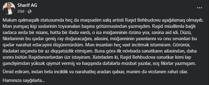 Qeyd edək ki, Şərif Ağayar bir neçə gün öncə yazdığı statusda bir neçə korifeyi, o cümlədən Rəşid Behbudovu səs tembrinə görə sərt tənqid, hətta təhqir etmişdi.