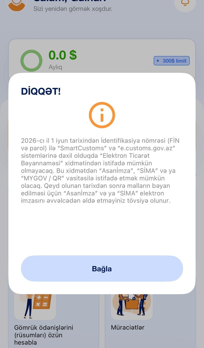 “2026-cı il 1 iyun tarixindən identifikasiya nömrəsi (FİN və parol) ilə “SmartCustoms” və “e.customs.gov.az” sistemlərinə daxil olduqda “Elektron Ticarət Bəyannaməsi” xidmətindən istifadə mümkün olmayacaq. Bu xidmətdən “Asanİmza”, “SİMA” və ya “MYGOV / QR” vasitəsilə istifadə etmək mümkün olacaq. Qeyd olunan tarixdən sonra malların bəyan edilməsi üçün “Asanİmza” və ya “SİMA” elektron imzasını əvvəlcədən əldə etməyiniz tövsiyə olunur”.
