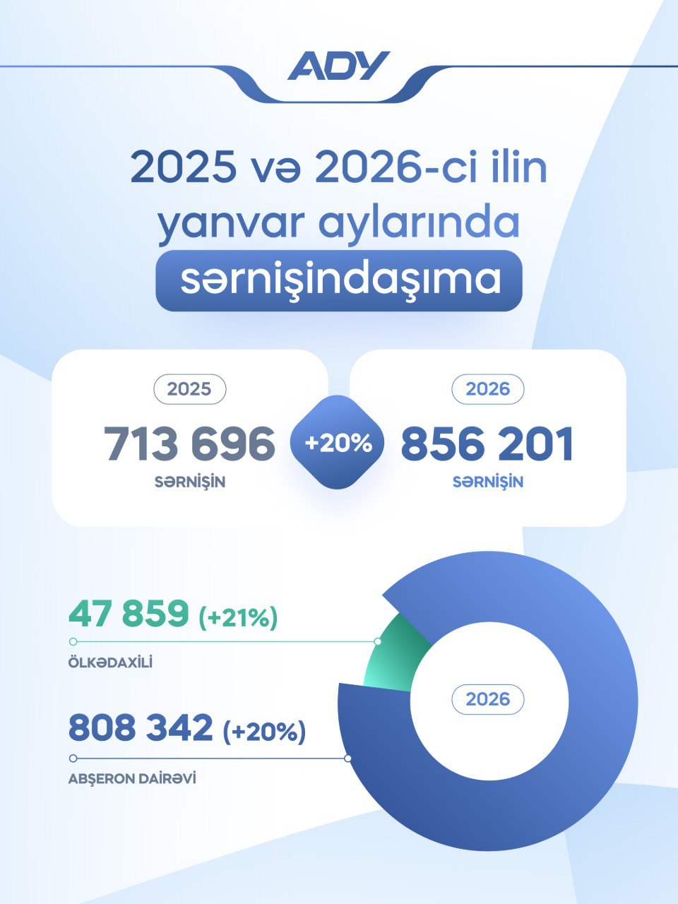 Təkcə, bu ilin yanvar ayında ölkədaxili 47 min 859 min sərnişin daşınıb ki, bu, 2025-ci ilin yanvar ayı ilə müqayisədə 21 % çoxdur.