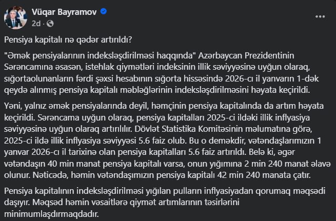 “Sərəncama uyğun olaraq, pensiya kapitalları 2025-ci ildəki illik inflyasiya səviyyəsinə uyğun olaraq artırılılır. Dövlət Statistika Komitəsinin məlumatına görə, 2025-ci ildə illik inflyasiya səviyyəsi 5.6 faiz olub. Bu o deməkdir, vətəndaşlarımızın 1 yanvar 2026-cı il tarixinə olan pensiya kapitalları 5.6 faiz artırıldı. Belə ki, əgər vətəndaşın 40 min manat pensiya kapitalı varsa, onun yığımına 2 min 240 manat əlavə olunur. Nəticədə, həmin vətəndaşımızın pensiya kapitalı 42 min 240 manata çatır.