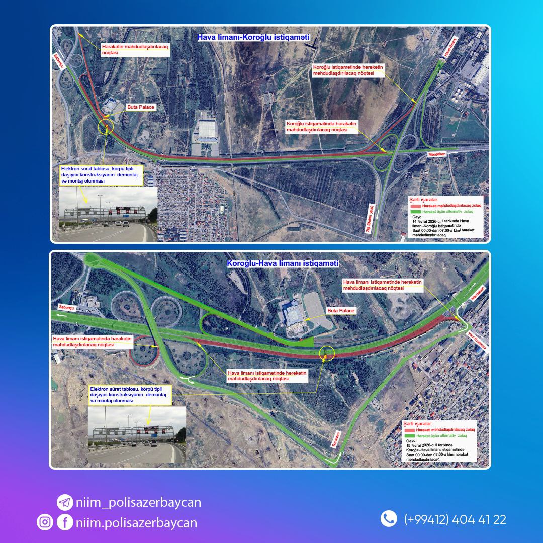Qeyd edilib ki, 14 fevral tarixində saat 00:00-dan 07:00-dək Hava limanı yolundan (Hava limanı körpüsündən) “Koroğlu” metro stansiyası istiqamətində, 15 fevral tarixində isə həmin saatlarda “Koroğlu” metro stansiyasından (Suraxanı dairəsi üzərindəki yol ötürücüsündən) Hava limanı istiqamətində nəqliyyat vasitələrinin hərəkətinə məhdudiyyət tətbiq ediləcək. Alternativ yol kimi, Mərdəkan şosesindən gələnlər Zığ şosesinə, şəhər istiqamətindən gələnlər isə Suraxanı rayonu, Xanlar Ələkbərov və 14 İyul küçəsinə istiqamətləndiriləcək. Eyni zamanda sürücülər şəhərdən Hava limanı istiqamətinə alternativ olaraq 8 Noyabr prospektindən Zığ yoluna keçməklə də hərəkət edə biləcəklər.