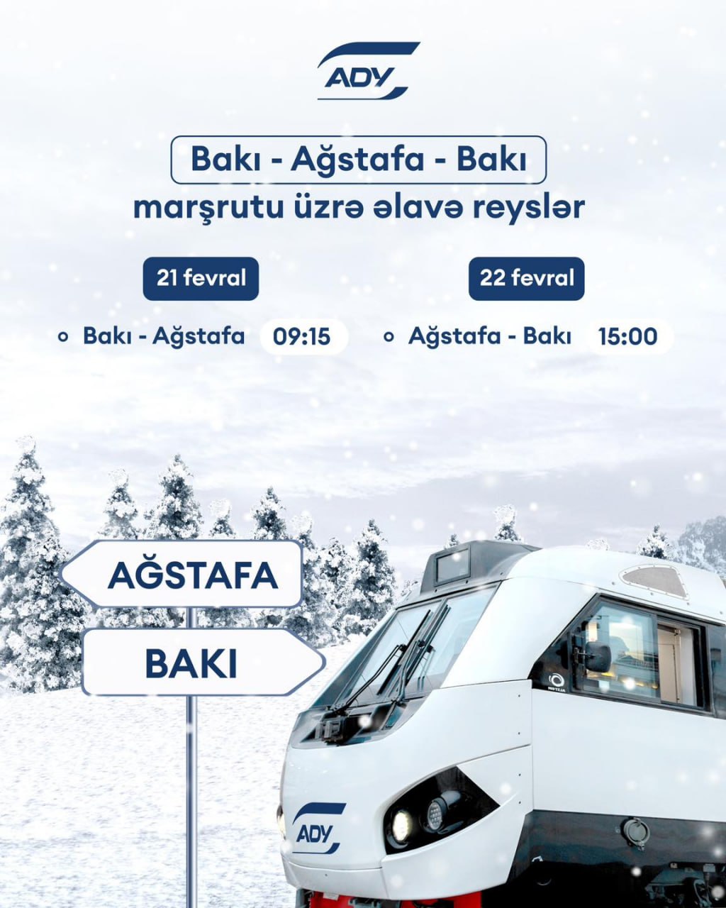 ADY artan sərnişin tələbatını təmin etmək məqsədilə 21 və 22 fevral tarixlərində Bakı-Ağstafa-Bakı istiqamətində əlavə qatar reysləri təyin edib.