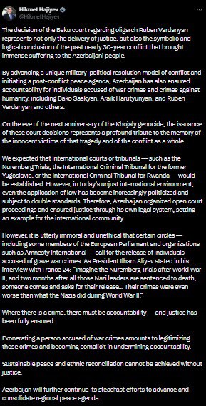 “Bakı Hərbi Məhkəməsinin Ruben Vardanyanla bağlı çıxardığı qərar təkcə ədalətin bərpası deyil, həm də Azərbaycan xalqına böyük əzablar yaşatmış təxminən 30 illik münaqişənin rəmzi və məntiqi yekunudur”.