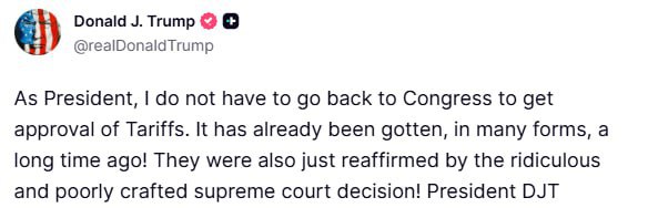 “Prezident kimi tariflərin təsdiqi üçün Konqresə yenidən müraciət etməyə ehtiyacım yoxdur. Bu təsdiq müxtəlif formalarda çoxdan verilib! Bunlar həmçinin Ali Məhkəmənin absurd və zəif əsaslandırılmış qərarı ilə yenicə təsdiqlənib”, - Tramp qeyd edib.
