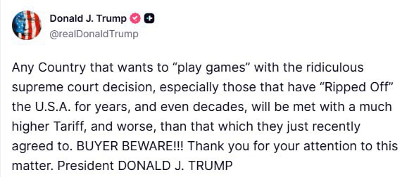 “Ali Məhkəmənin absurd qərarı ilə oyun oynamaq istəyən istənilən ölkə, xüsusilə də illər və hətta onilliklər boyu ABŞ-ı aldadan ölkələr, yaxın zamanda razılaşdıqları tarifdən qat-qat daha yüksək rüsumlarla üzləşəcək. Hətta bundan da pis nəticələr ola bilər. Alıcılar, diqqətli olun!”