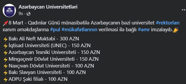 8 Mart - Qadınlar Günü münasibətilə Azərbaycanda bir sıra Universitetlərdə xanım əməkdaşlara pul mükafatları verilib.