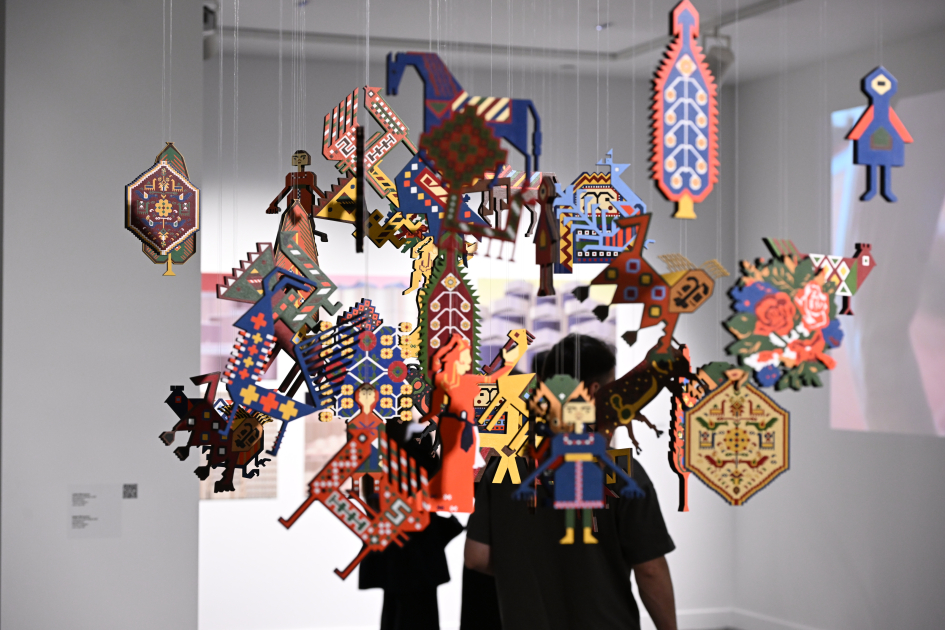Müstəqil rəssam Kafiyə Eyvazova builki festivala "Pəncərədən baxış" əsəri ilə qatılıb. "Üç ildir festivala qatılıram və ilk dəfədir ki, xalça texnikasında iş təqdim edirəm. Əsər xovlu xalça texnikasında toxunub və insanları ailə strukturunu sorğulamağa dəvət edir. Burada kişi motivləri qadın motivlərini sanki qoruyurmuş kimi görünsə də, onu məhdudlaşdırır. Getdikcə qadının üz cizgiləri yox olur. Çünki məhdudiyyət insanın şəxsiyyətini arxa plana salır və görünməz edir. Əsər cəmiyyətimizə qadınlara dəyər verməyi, onları dinləməyi və azadlığını məhdudlaşdırmamağı tövsiyə edir".
