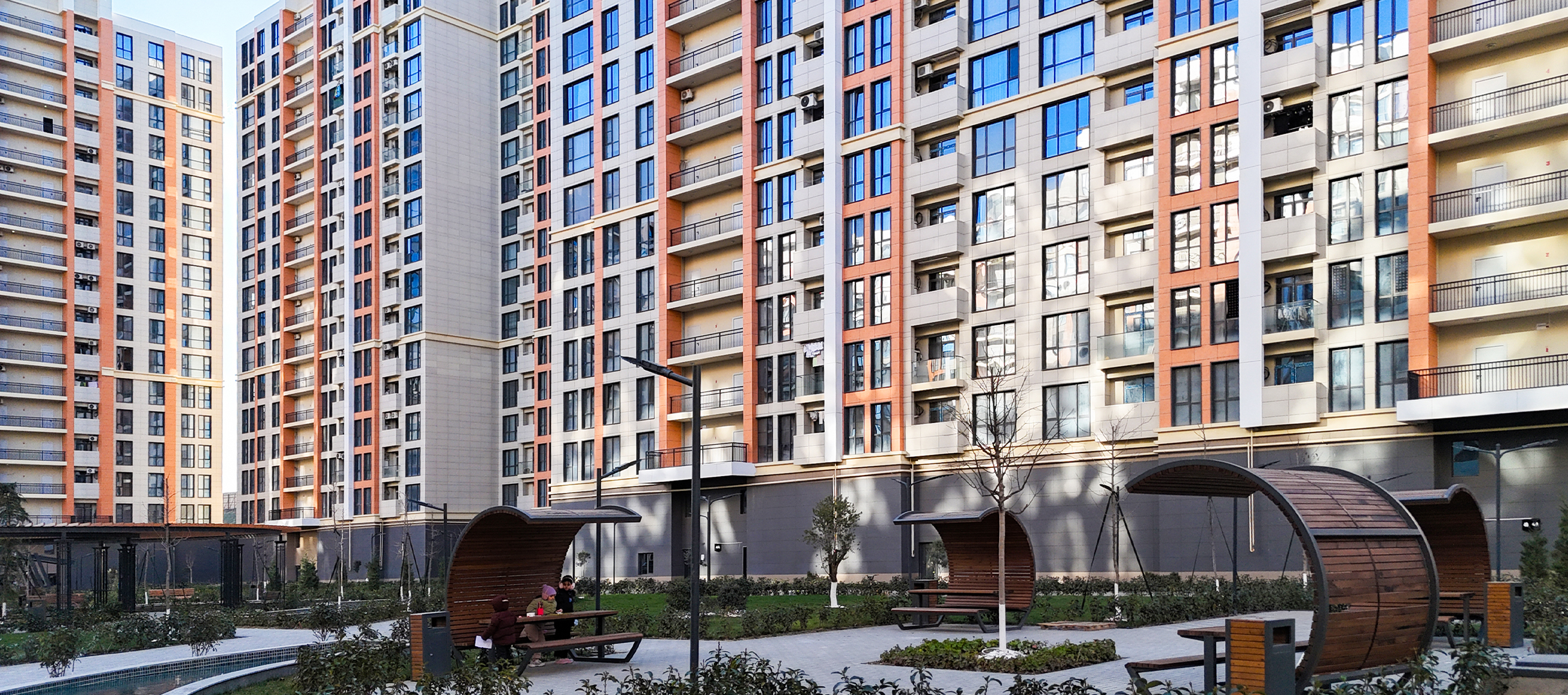 Binaların müasir memarlıq üslubunda olan fasadlarında uzunömürlü materiallardan istifadə olunub. Mənzillərdə döşəmədən tavana qədər panoram pəncərələr tətbiq edilib. Mənzillərin planlanması optimal və itkisiz şəkildə edilib, səs və istilik izolyasiyası tətbiq olunub ki, bu da həm komfort, həm də enerji baxımından daha səmərəli yaşayış mühiti yaradır.