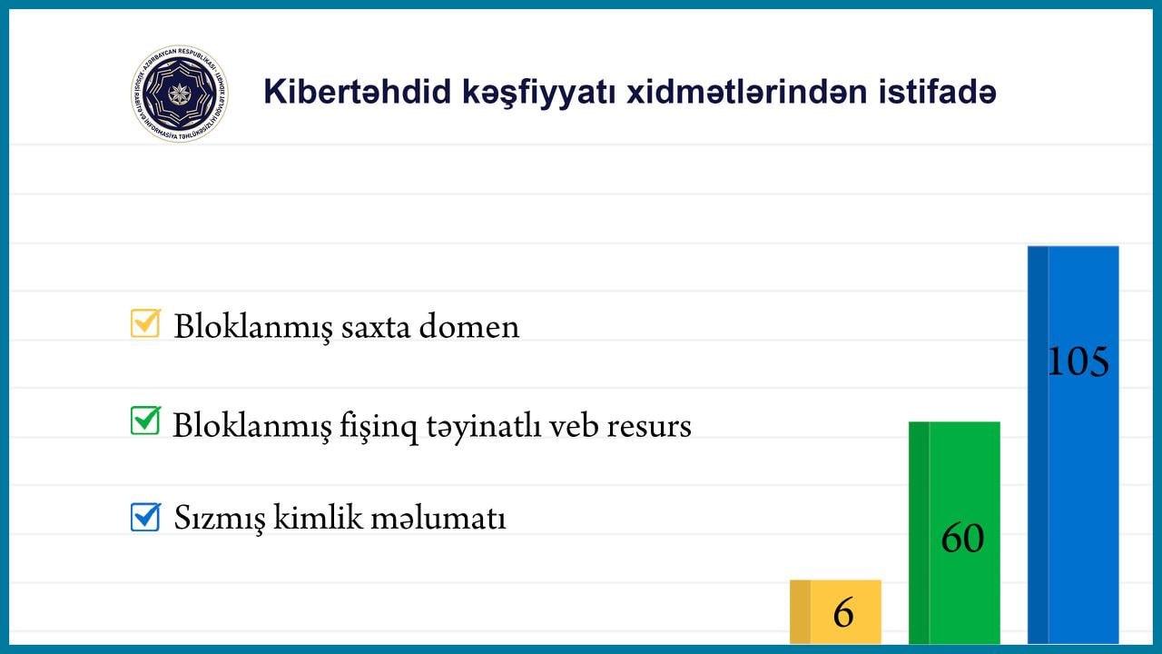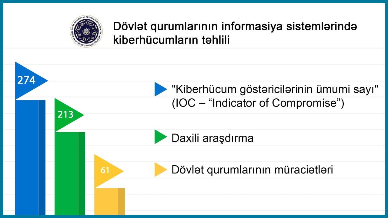 "Dövlət qurumlarının informasiya sistemlərində XRİTDX tərəfindən aparılan daimi monitorinq nəticəsində aşkarlanan kiberhücumların təhlilinə əsasən cari ilin ilk üç ayı üzrə 274 kiberhücum göstəricisi (IOC - "Indicator of Compromise") müəyyən edilərək mərkəzləşdirilmiş qaydada bloklanıb. Bu kibertəhdidlərin 213-ü daxili araşdırma, 61-i isə dövlət qurumlarının müraciətləri əsasında müəyyən olunub.