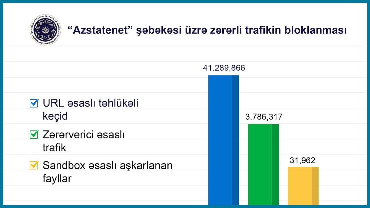 "AzStateNet" şəbəkəsi üzrə tətbiq edilən yeni nəsil mühafizə avadanlıqları vasitəsilə URL əsaslı 41 289 866 təhlükəli keçid, zərərverici əsaslı (virus, casus proqram və digər zərərli fəaliyyət əlamətləri daşıyan) 3 786 317 trafik, eləcə də "Sandbox" mühafizə sistemi vasitəsilə 31 962 zərərverici tərkibli fayl blok edilərək son istifadəçilərin yoluxmasının qarşısı alınıb.