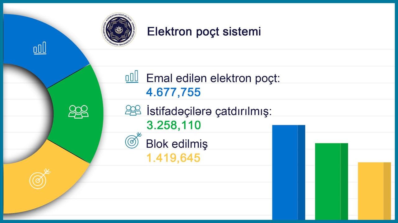 XRİTDX tərəfindən dövlət qurumları üçün yaradılmış dövlət elektron poçt xidmətində 4 677 755 elektron məktub emal edilib ki, onlardan 3 258 110-u istifadəçilərə çatdırılıb, 1 419 645-i isə zərərli tərkibli olması səbəbindən bloklanıb.