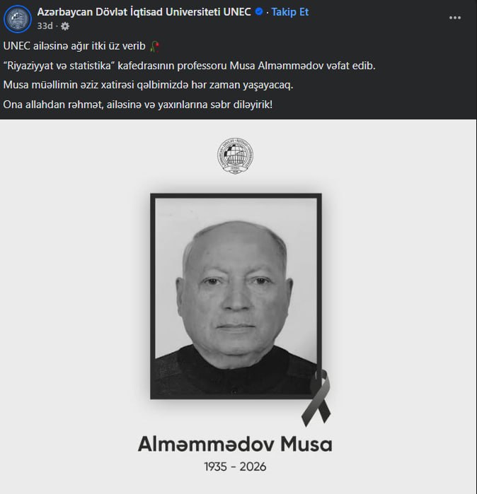 Azərbaycan Dövlət İqtisad Universitetinin (UNEC) professoru Musa Alməmmədov vəfat edib.