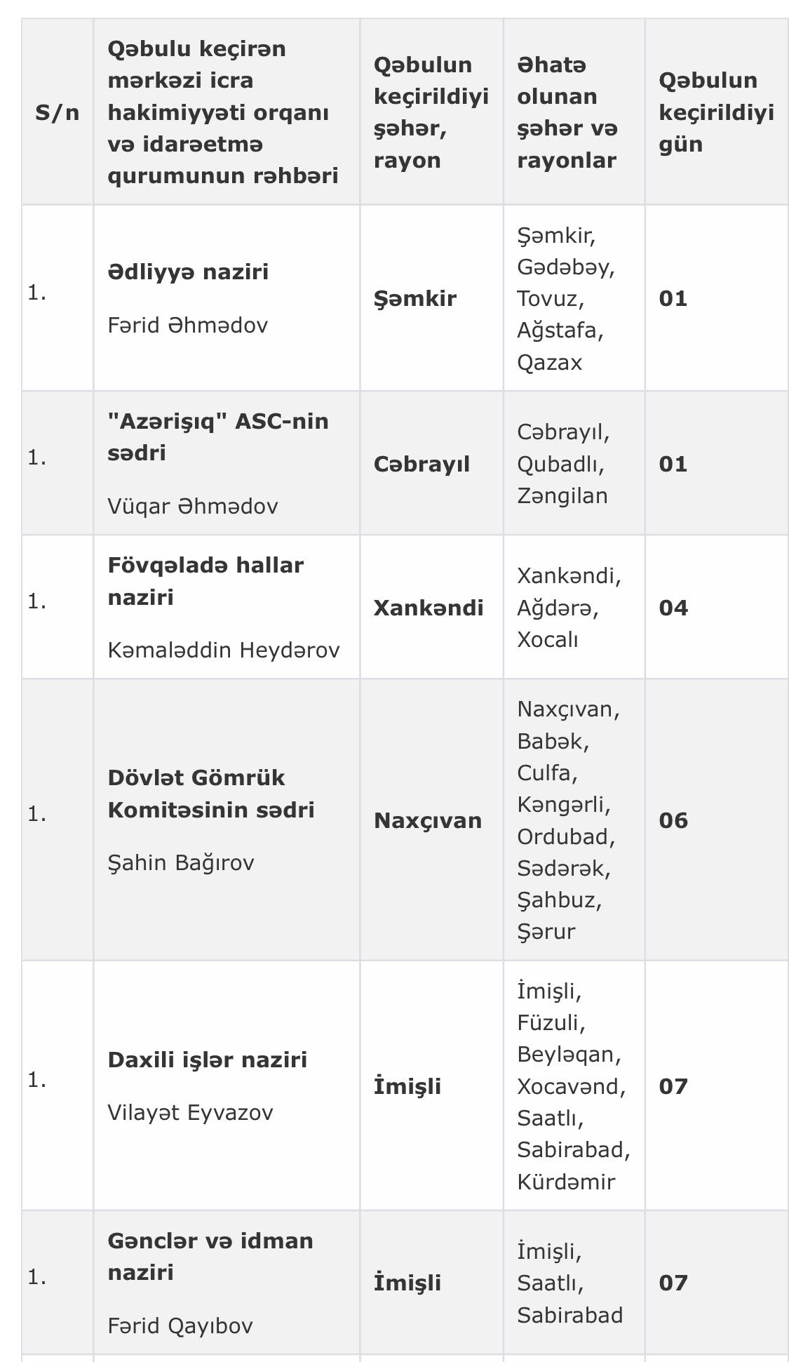 Hazırda oxunan: Hökumət üzvlərinin mayda keçiriləcək vətəndaş qəbulu CƏDVƏLİ