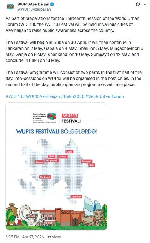 Ümumdünya Şəhərsalma Forumunun On Üçüncü Sessiyasına (WUF13) hazırlıq çərçivəsində bütün ölkə miqyasında ictimai məlumatlılığı artırmaq üçün Azərbaycanın müxtəlif şəhərlərində WUF13 Festivalı keçiriləcək.