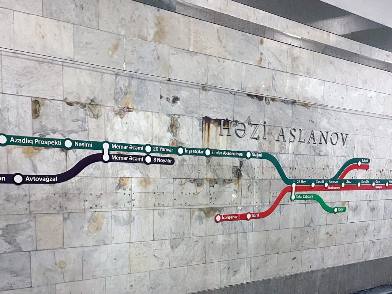 “Həzi Aslanov” metro stansiyasının perron boyunca divarlarında suyun açıq-aşkar izləri və çoxsaylı sızma əlamətlərinin görünməsi ilə bağlı sosial şəbəkələrdə fotolar yayılıb.
