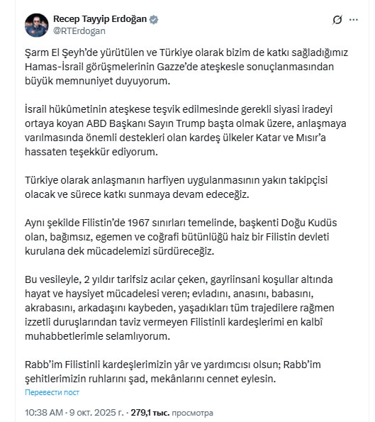 "Şarm Əş-Şeyxdə keçirilən və Türkiyə olaraq bizim də töhfə verdiyimiz HƏMAS-İsrail danışıqlarının Qəzzada atəşkəslə nəticələnməsindən böyük məmnuniyyət duyuram", - deyə o qeyd edib.