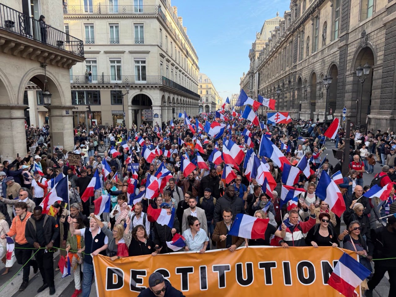 Parisdə hökumət böhranı fonunda ölkə prezidenti Emmanuel Makronun istefası tələbi ilə aksiya keçirilib.