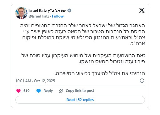 Bizim.Media xəbər verir ki, bunu İsrailin müdafiə naziri İsrael Kats "X" sosial şəbəkə hesabında yazıb.