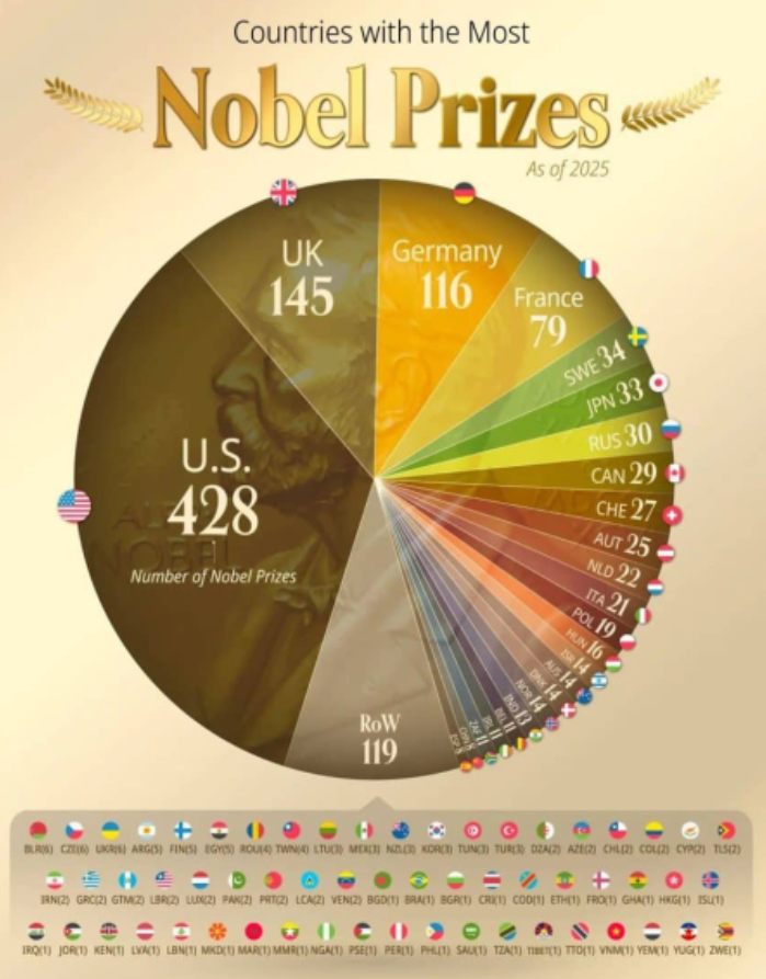 Aşağıdakı infroqrafikada 2025-ci ilə olan məlumata əsasən ən çox Nobel mükafatı qazanan ölkələr sıralanıb. Reytinq innovasiyaların, elmi və sosial tərəqqinin əsas ocaqlarını müəyyənləşdirir. Vizualizasiya üçün məlumatlar “Vikipediya”nın “Ölkələr üzrə Nobel laureatlarının siyahısı”ndan götürülüb və milli mənsubiyyətə görə verilmiş ümumi mükafat sayını əhatə edir.