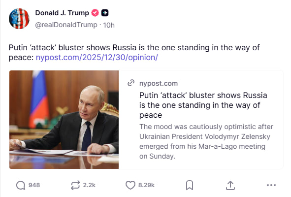 Bizim.Media xəbər verir ki, ABŞ lideri “Truth Social” hesabında “New-York Post” nəşrinin “Putinin "hücum" iddiası Rusiyanın sülh yoluna mane olduğunu göstərir” başlıqlı məqaləsini paylaşıb.