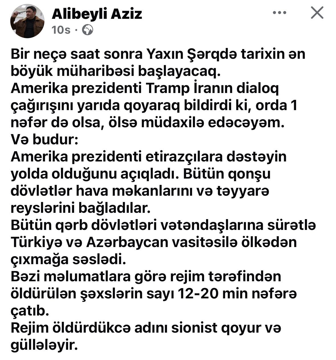 “Və budur, Amerika prezidenti etirazçılara dəstəyin yolda olduğunu açıqladı. Bütün qonşu dövlətlər hava məkanlarını və təyyarə reyslərini bağladılar. Bütün qərb dövlətləri vətəndaşlarına sürətlə Türkiyə və Azərbaycan vasitəsilə ölkədən çıxmağa səslədi. Bəzi məlumatlara görə, rejim tərəfindən öldürülən şəxslərin sayı 12-20 min nəfərə çatıb”.