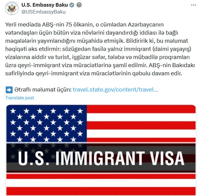Diplomatik missiyadan bildirilib ki, yerli mediada ABŞ-nin 75 ölkənin, o cümlədən Azərbaycanın vətəndaşları üçün bütün viza növlərini dayandırdığı iddiası ilə bağlı məqalələrin yayımlandığını müşahidə ediblər: