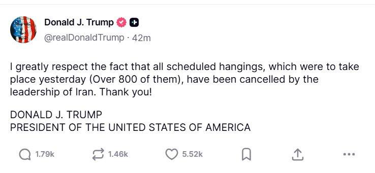 "Dünən üçün planlaşdırılan edamların (800-dən çox) İran rəhbərliyi tərəfindən ləğv edilməsini yüksək qiymətləndirirəm. Təşəkkür edirəm", - Tramp qeyd edib.