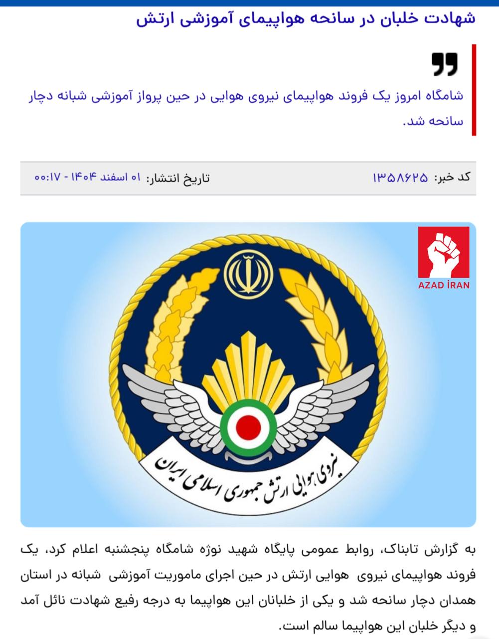 Bizim.Media “Azad İran” teleqram kanalına istinadən xəbər verir ki, təyyarədə olan iki pilotdan biri həlak olub.